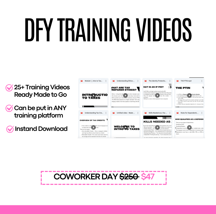 WyKeshia Coleman-Griffin These vids are exactly what I needed aid in teaching my beginning tax pros training class this year! Thank you so much for putting this together! It will save me so much time for not having to create the material myself! And then to get all that info at the discounted rate I did... I'm amazed and grateful💪🏾👏🏾🎉