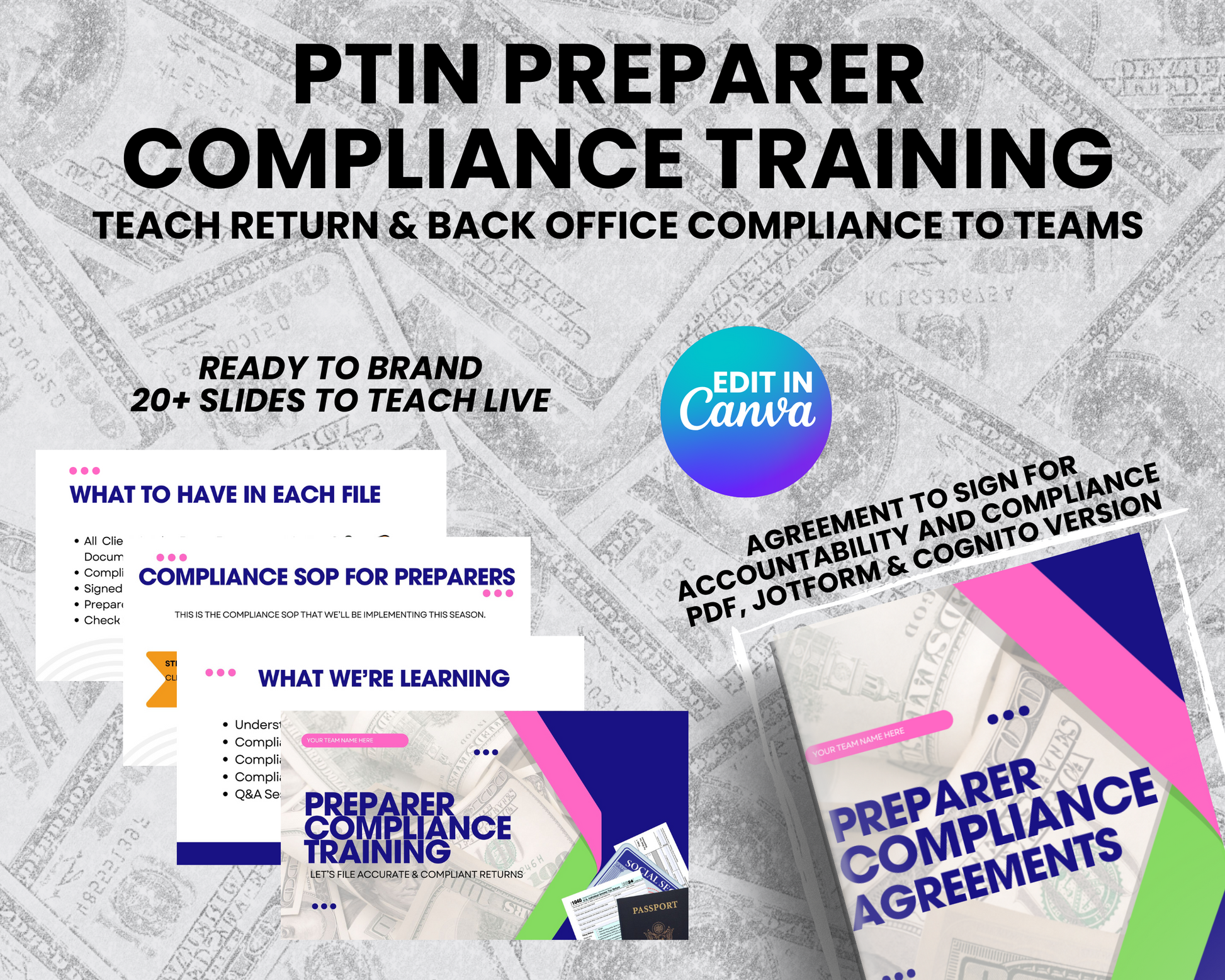 Need to teach your PTINs about compliance and do your part as a SB or ERO? We got you covered. This is already ready to go with a 20+ training slides ready to brand to your company with the full steps, compliance checklist, and agreements for them to sign after class in PDF form, JOTFORM, and COGNITOFORMS.